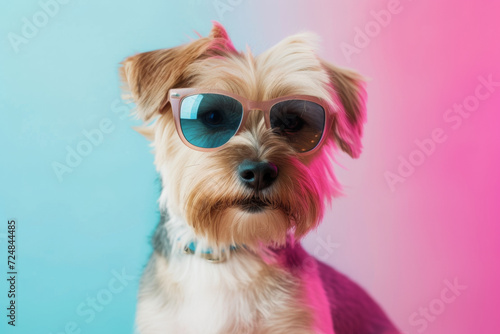 dog wearing sunglasses on pastel background.