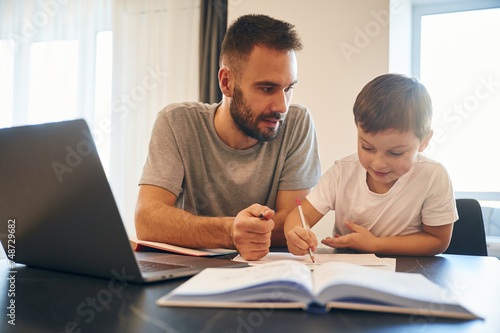 Doing homework. Father and son are at home by the table