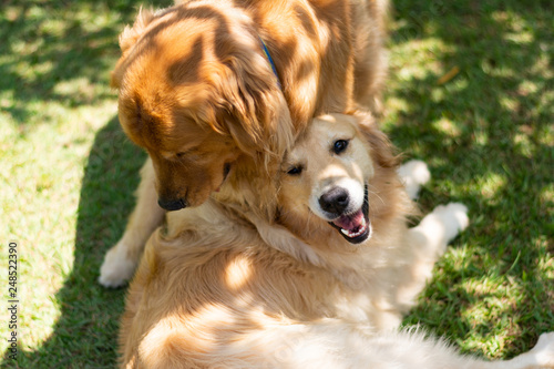 Dois cachorros da raça Golden retriever brincando de morder um ao outro no gramado num dia de sol