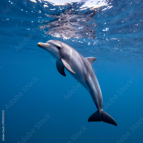 Dolphin Swimming Gracefully Underwater in Clear Blue Ocean with Sunlight Filtering Through Surface Creating Natural Reflection and Bubbles Around Marine Animal