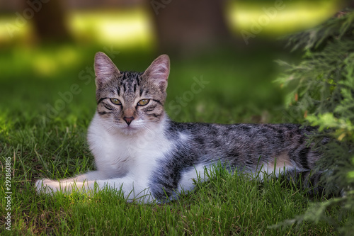 Domestic cat, looking straight at camera, llying down on the grass portrait at garden, iin summer day