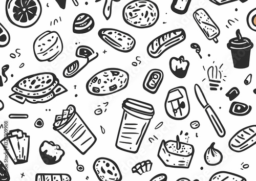 Doodle Delight: A whimsical collection of sketched food items, forming a lively and playful pattern, perfect for culinary or design projects.