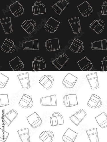 doodle pattern with mugs, glasses, background with icons of glasses. collection for food store, poster, banner with black and white background