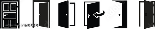 Door icon set.Door open and close sign vector design.open sign . handle . isolated transparent . black outline and filled version.Open door entrance logout flat vector icon for apps and websites.