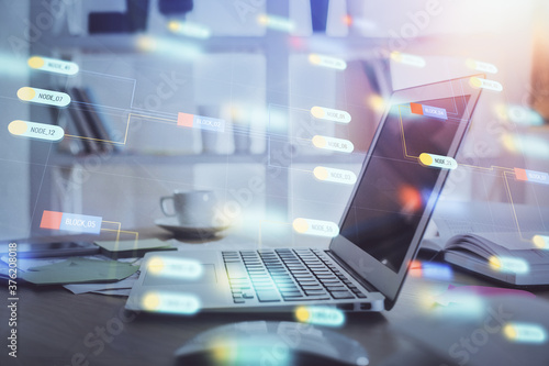 Double exposure of computer and technology theme drawing. Concept of innovation.