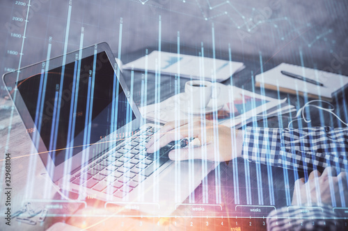 Double exposure of forex chart with man working on computer on background. Concept of market analysis.