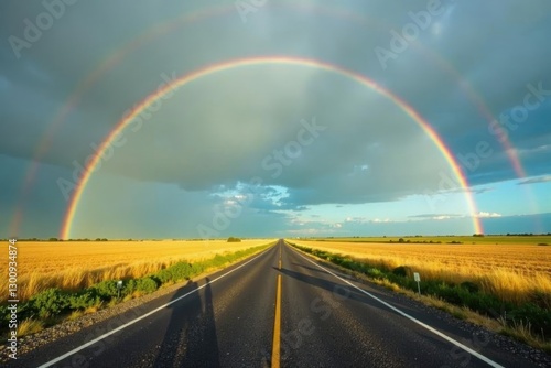 weather, colours, spring, sun, amazing, natural phenomenon, summer, grass, wonder, field, arc, beautiful, rural, atmosphere, highway, phenomena, nature, sunshine, meadow, tree, peaceful, bright, optical illusion, scenic, idylli, light, landscape, cloud, rainbow, serene, view, open road, road trip, country road, spectacular, sky, horizon, vibrant, colourful, travel