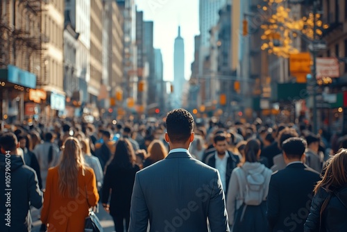 city, urban, street, city landscape, crowd, anonymous, building, metropolis, tied-up, downtown, man, walking, commuter, skyscraper, tall building, pedestrian, urban life, city life, urban scene, people, day, sunlight, daylight, blur, perspective, forward, background, focused, direction, city centre, city street, bustling, goal, vision, pavement, architecture