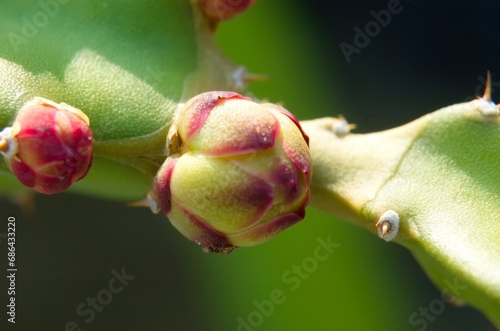 Dragon fruit flower, a cactus that produces flowers and fruit. Young flower buds began to appear on the green cactus branches. Super red type of Red Dragon Fruit.