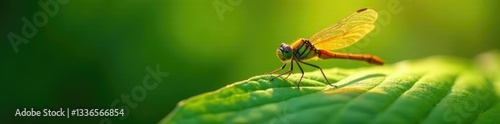 Dragonfly's body glistening in sunlight on a leaf surface,, nature