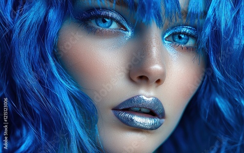 Dramatic close-up of a woman with electric blue hair and metallic silver lipstick, avant-garde beauty