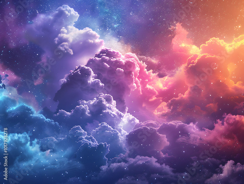 Dramatic cloudscape painted in hues of blue and dark, with hints of light peeking through, creating a magical space of space