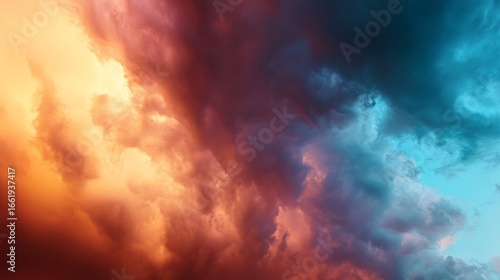 Dramatic colorful cloud formations during a storm or sunset, deep reds oranges purples blues,