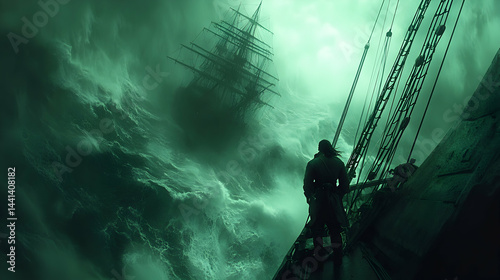 Dramatic image of a lone sailor on a ship facing a raging storm at sea, with a ghostly galleon in the background. A captivating scene of adventure and peril.