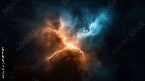 Dramatic interstellar nebula with contrasting orange and blue gas clouds and stars in deep space setting