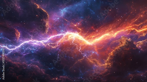 lightning, electricity, cosmic, thunder, cloud, storm, celestial, high-coloured, colours, energy, nature, atmosphere, dramatic, weather, sky, phenomena, swirl, illumination, night, universe, galaxy, power, charge, brightness, electric, stormy, beauty, ionosphere, wave, shock, current, astrophysics, electromagnetic, landscape, dynamic, artistry, abyss, radiance, mystery, science, movement, explosion, generative, ai, light, illustration, big bang