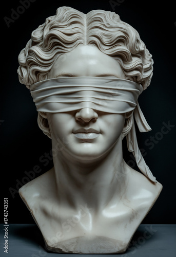 sculpture, marble, bust, classical, art, photo, black background, blindfold, curl, shadow, highlight, upper body, three-dimensional, artistic, portrait, figure, detail, wavy hair, creative, aesthetic, monochrome, elegance, beauty