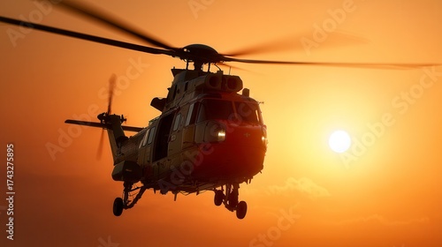 Dramatic military helicopter silhouette flying against vibrant orange sunset sky with glowing sun in background, aviation transportation in golden hour light
