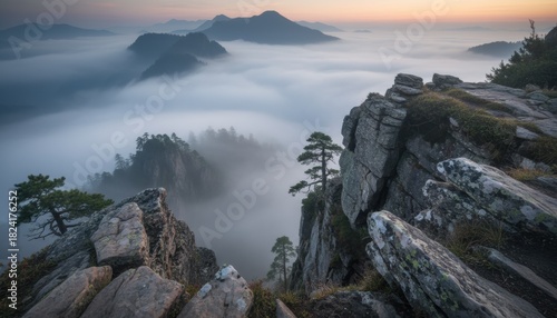 mountain, cliff, rock, forest, fog, cloud, vale, alps, europa, landscape, sunrise, dawn, horizon, travel, adventure, exploration, freedom, nature, tree, pine, remote, dramatic, panoramic, mist, sky, serene, trail, background, ai, generated