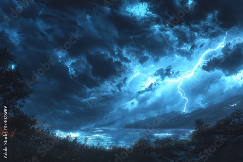 night, sky, cloud, storm, lightning, lake, water, mountain, landscape, dark, blue, dramatic, nature, weather, electricity, power, energy, ominous, moody, intense, thunder, cloudscape, silhouette, tree, bush, rock, shore, waterfront, mystical, serene, tranquil, awe, wonder, immensity, depth, mystery, darkness, vibrant, colours, contrast, texture, atmosphere, scene, view, image, picturesque