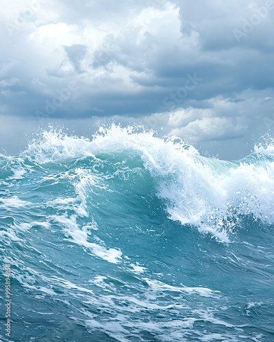 Dramatic ocean waves crashing under a cloudy sky, capturing the raw power and beauty of the sea.