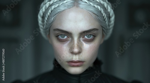 dramatic, portrait, woman, braided, white hair, closeup, serious, intense, blue eye, moody, mysterious, elegant, fashion, beauty, model, studio, high contrast, emotional, cinematic, captivating, striking, atmospheric, female, head shot, monochrome, pensive, regal, sophisticated