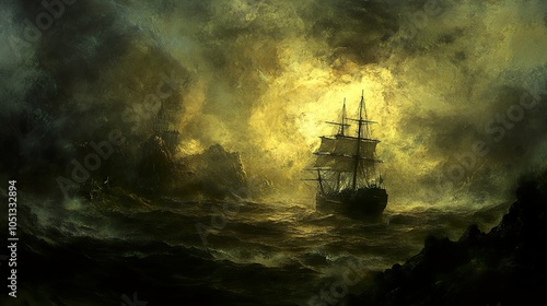 Dramatic Seascape: Ship Sailing Through Stormy Waters
