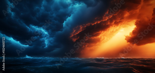 sky, ocean, wave, dramatic, dark, fiery, cloud, turbulent, sea, storm, stormy, surge, orange, image, epic, contrast, landform, skyline, coastal, tempest, thunder, power, art, motion, wildness, scenery, colours, movement, tranquil, gale, weather, energy, landscape, seascape, sunset, cloudscape, lightning, scenic