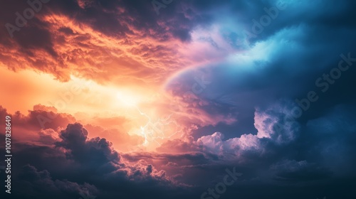 Dramatic Stormy Sky with Lightning and Rainbow, an intense scene showcasing dark clouds and striking lightning, contrasted by a faint rainbow that signifies hope amidst the chaos.