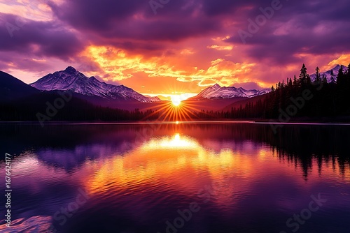 Dramatic Sunset Over Mountain Lake with Reflection and Vivid Purple Sky and Clouds