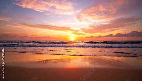 sunset, ocean, beach, wave, cloud, sky, gold, vibrant, colours, horizon, tranquil, nature, beautiful, scenic, dramatic, colourful, peaceful, paradise, summer, vacation, travel, warm, golden hour, serene, picturesque