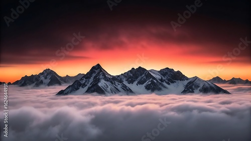 Dramatic sunset over snow-capped mountains emerging from a sea of clouds peak summit