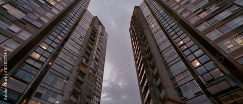 Dramatic upward view of twin high-rise buildings against a dusky sky, showcasing architectural symmetry and urban grandeur.