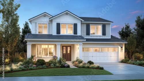 house, home, architecture, farmhouse, property, design, building, residence, dwelling, modern, contemporary, style, family, residential, exterior, landscape, garden, grass, lighting, night, evening, window, door, garage, driveway, roof, shingle, shutter, beige, white, grey, brown, plant, tree, front, yard, illuminated