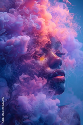 Dreamlike Artistic Portrait of a Woman with Eyes Closed Surrounded by Colorful Clouds of Smoke in Vibrant Neon Lights and Ethereal AtmosphereClouds of smoke