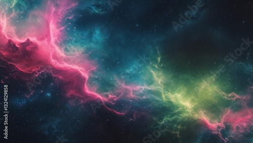 Dreamy abstract noise-textured background with a celestial-inspired color palette of vibrant pinks, deep blues, and glowing green, seamlessly diffused over a mysterious dark void.