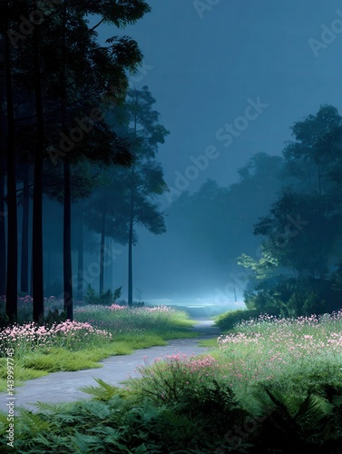 Dreamy background, deep forest, distant view, fluorescence, flowers, small path, winding path leading to a secluded spot, bright ahead.