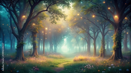 Dreamy, ethereal forest landscape at dusk , enchanted, trees, enchanted, trees