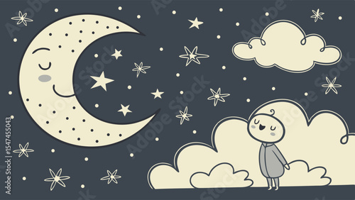 moon, star, cloud, children, night, sky, dream, sleep, peace, happy, calm, blue, cream, dark, light, cute, simple, cartoon, whimsical, illustration, wonder, awe, joy, serene, celestial, figure, outline, texture, dot, smile, look, imagination, evening, quiet, gentle, cosy, fantasy, magic, space, children, person, doodle, vignetting, minimal, graphic, sweet, crescent, gaze