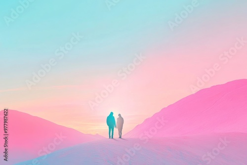 pastel, journey, couple, love, sunset, sunrise, landscape, mountain, pink, blue, surreal, dreamy, romantic, adventure, togetherness, wanderlust, exploration, travel, human relationships, hope, future, serenity, peace, calmness, minimal, abstract, art, digital artwork, illustration, vibrant, colourful, gradient, soft, aethereal, magical, fantasy, mood, atmosphere, scenic, destination, nature, horizon, sky, cloud, light