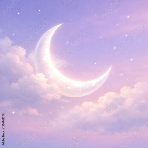 ramadan, eid, crescent, moon, islamic, muslim, religion, faith, holy, night, sky, star, cloud, glowing, pastel, purple, pink, lavandula, lilac, aethereal, magical, dreamy, serene, peaceful, light, soft, atmospheric, spirituality, prayer, wallpaper, illustration, digital, art, celestial, astronomy, evening, twilight, background, celebration, greeting, invitation, beauty