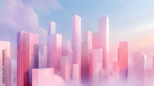 city landscape, building, pink, tower, skyscraper, pastel, dreamy, cloud, fog, sunrise, dawn, architecture, urban, modern, futuristic, aerial, fantasy, illustration, digital, art, design, aesthetic, soft, light, gentle, calm, serene, peaceful, tranquil, harmony, hopeful, optimistic, romantic, whimsical, aethereal, subtile, glowing, structure, city, horizon