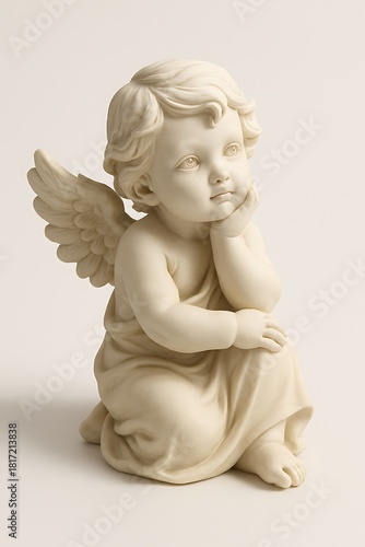 Dreamy porcelain angel figurine kneeling with wings, soft beige statue on neutral background