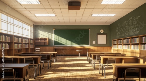 D-rendered high school classroom with academic bookshelves, neatly aligned chairs, and a chalkboard wall