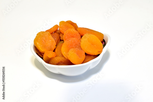 Dried apricots, dried apricots, in a deep plate on a white background.