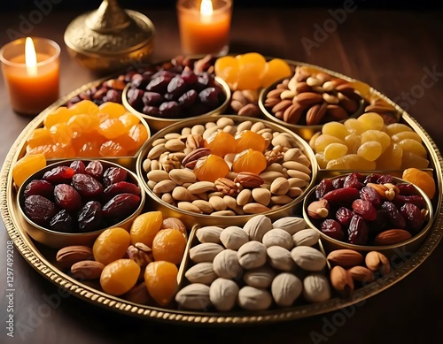 nut, assortment, dried fruit, tray, gold, arrangement, still life, almond, apricot, date, pistachio, pecan, bowl, glowing, candle, lit, celebration, food, snack, sweet, healthy, epicure, delicious, luxury, rich, elegant, festive, offering, party, gathering, dish, traditional, presentation, indoor, macro, table, centrepiece, cookery, nourishment