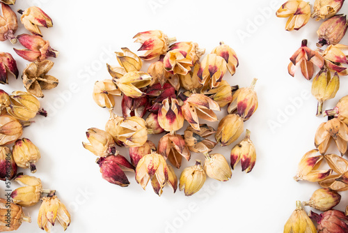 Dried Organic Hibiscus Seed Images, Stock Photos. Dry Hibiscus Seed cover background texture.top view. copy space.