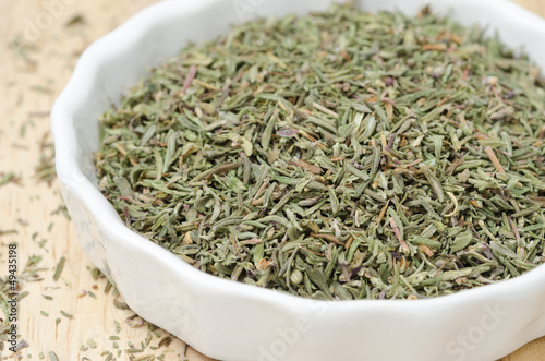 dried thyme in a white bowl, selective focus, closeup