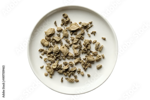 herb, dried, spice, food, ingredient, cooking, favor, seasoning, natural, organic, kitchen, culinary, aroma, texture, rustic, earthy, brown, green, plate, white, top, view, closeup, detail, healthy, epicure, delicious, fresh, sprinkle, garnishing, meal, receipe, plant, botanical, epicure, nourishment