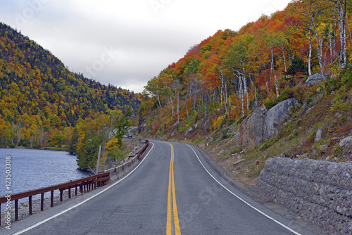 Driving into the mountains with Autumn foliage with red, orange and yellow fall colors in A Northeast forest